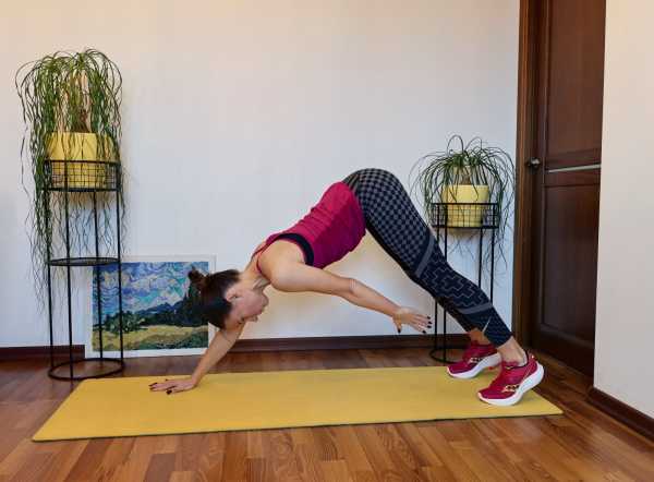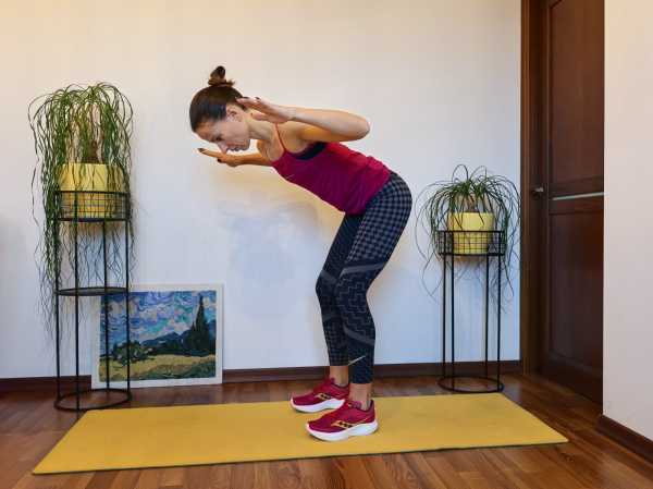 Исходное положение: стоя, стопы на ширине таза. Наклонитесь и вытяните руки вперед. Позвоночник при этом должен оставаться прямым. Тянитесь макушкой вперёд, а седалищными костями назад, создавая осевое вытяжение в теле. Колени немного согните. На выдохе подтяните локти к ребрам, сводя лопатки, на вдохе снова вытяните руки вперёд. Корпус при этом остаётся неподвижным.