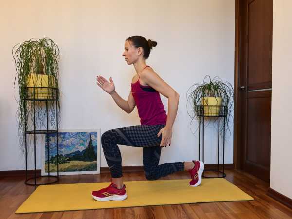 Встаньте в разножку: левая нога впереди, правая сзади на полупальцах. Распределите вес тела равномерно между двумя ногами. Корпус держите вертикально, подтяните живот и опустите плечи. На вдохе опуститесь вниз в положение выпада (руки можно поставить на талию, либо, держать, как на фото: правая рука впереди). На выдохе энергично вытолкнитесь вверх и сделайте выпрыгивание левой ногой, выводя при этом правое колено и левую руку вперёд. После приземления правую ногу сразу уведите назад и сделайте следующее повторение. Как и в предыдущем упражнении, нужно прыгать как мячик или пружинка, без пауз.